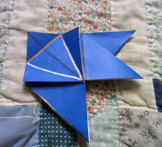Step 5. This is quite complex step, and if I were a more dutiful blogger I would have taken pictures that illustrated it in full :( Behind the gold line, there should be a kind of hidden flap. Pull it out, and then valley fold it along the gold line. The end result should look like a pinwheel, as shown in the next picture.